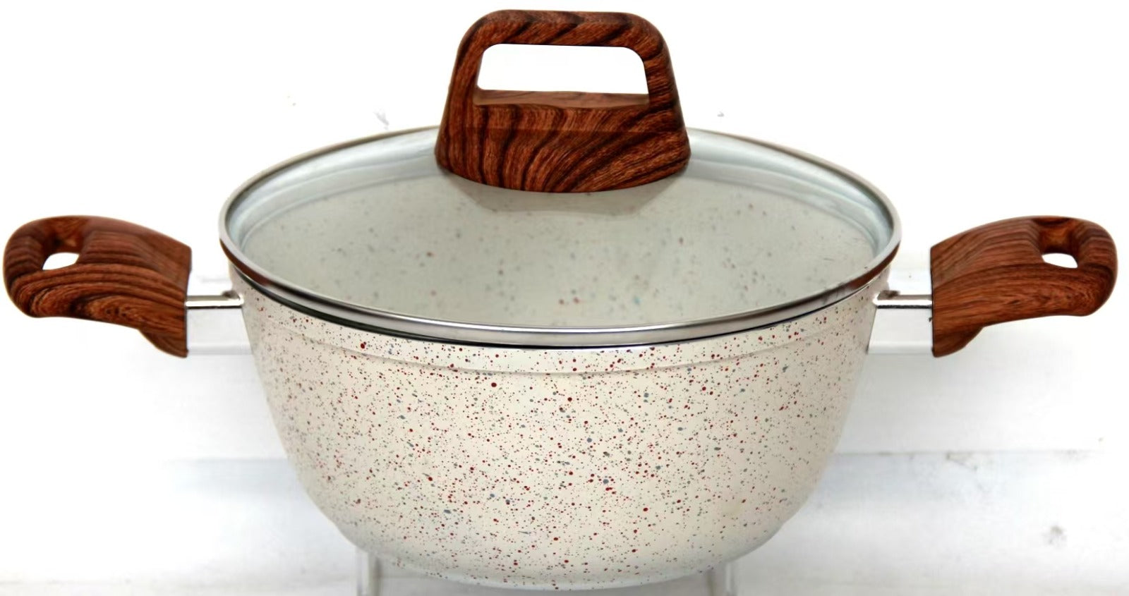 Upgrade your kitchen with this stylish non-stick cooking pot, featuring a speckled beige finish and wood-look ergonomic handles. The heat-resistant glass lid allows you to monitor your meals without lifting the lid. Perfect for cooking rice, soups, pasta, and stews.