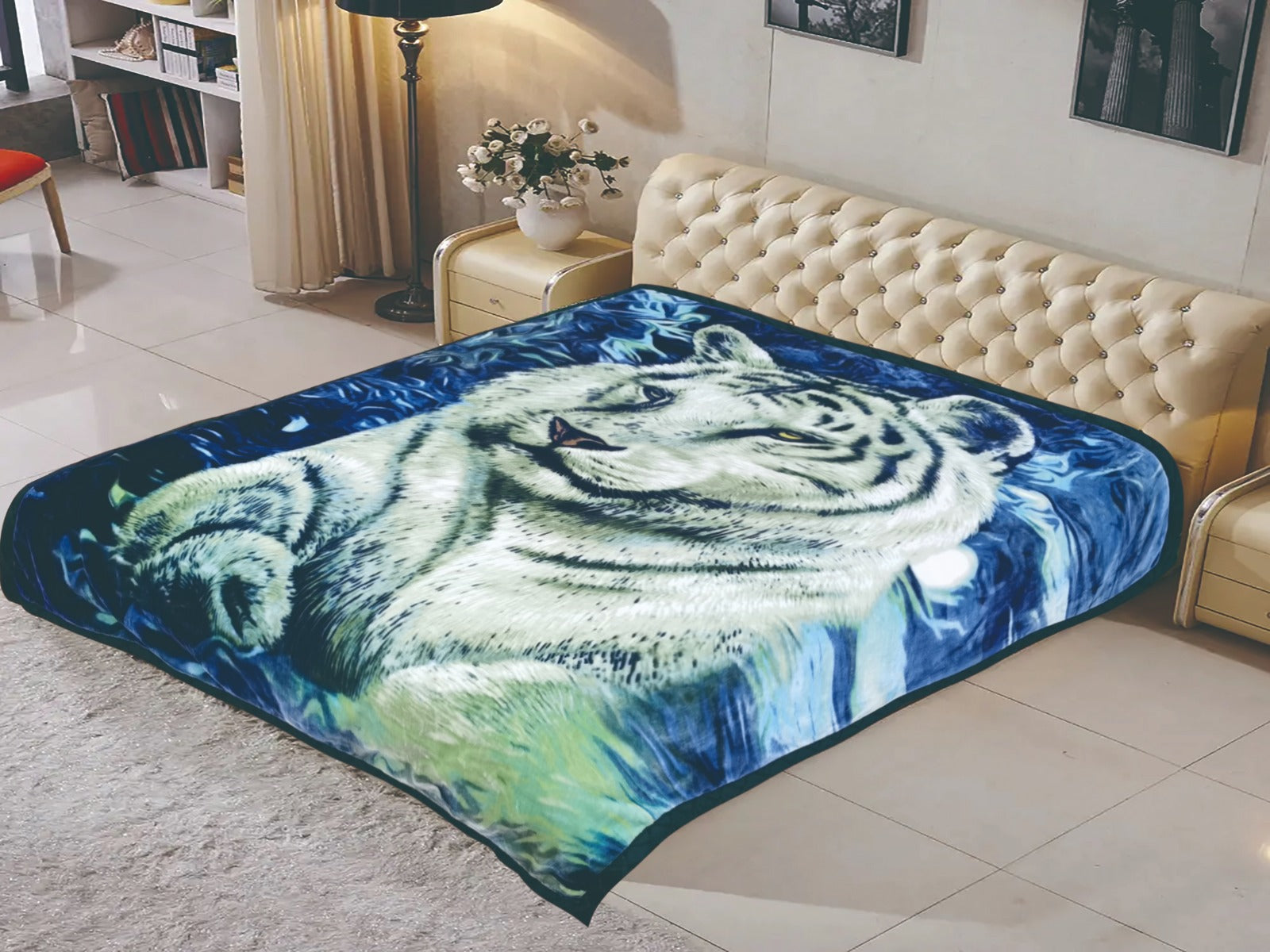 A premium-quality blanket with a luxuriously soft texture and artistic patterns on both sides. Perfect for cozy winter nights, it offers warmth and style, making it an elegant addition to any bedroom. The design adds a subtle decorative charm.