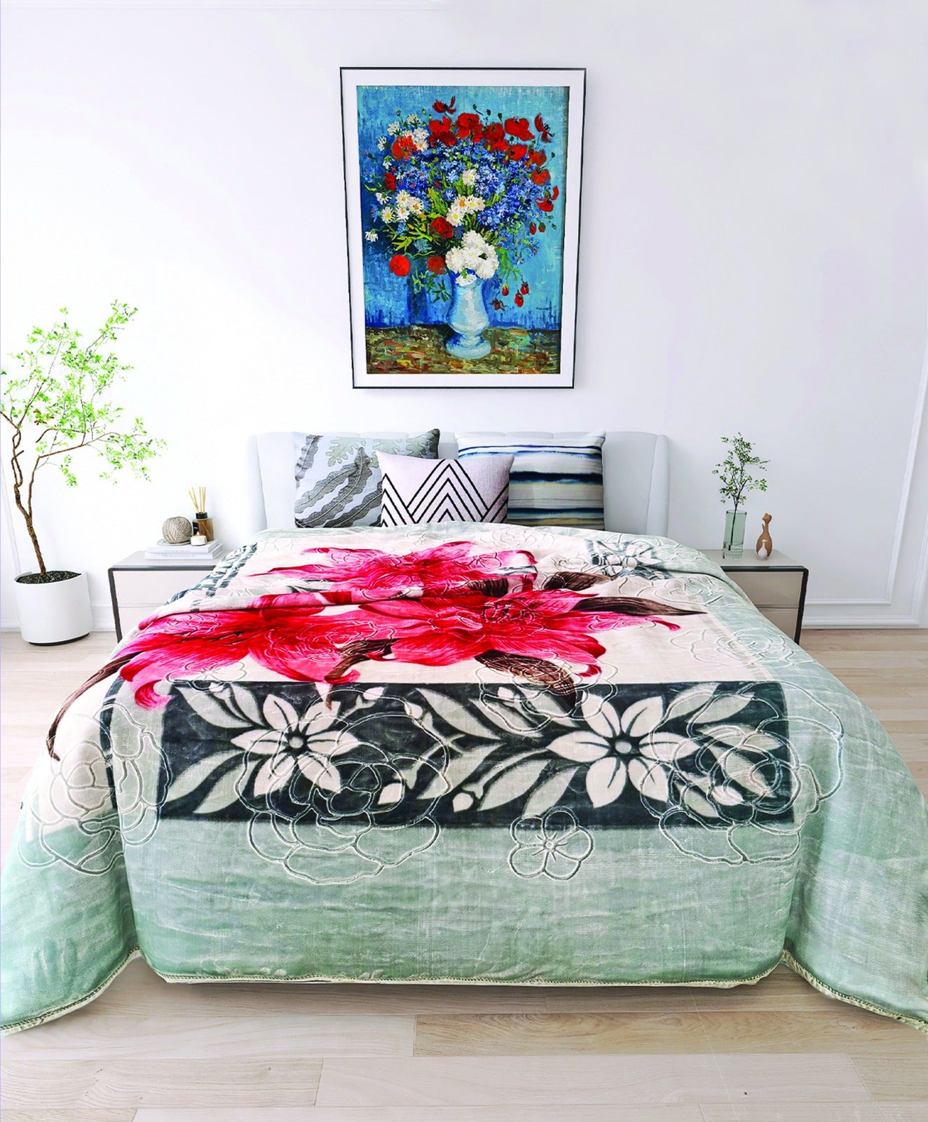 A premium-quality blanket with a luxuriously soft texture and artistic patterns on both sides. Perfect for cozy winter nights, it offers warmth and style, making it an elegant addition to any bedroom. The design adds a subtle decorative charm.