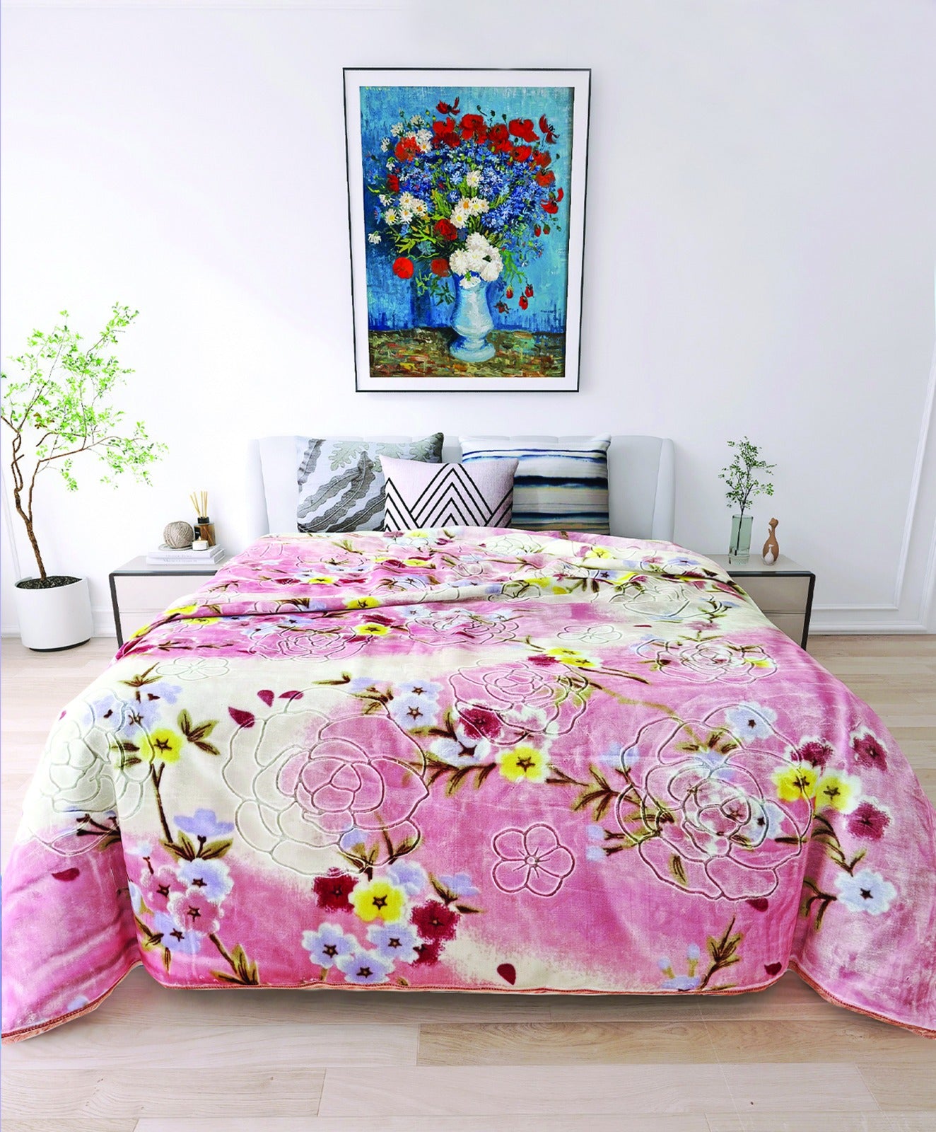 A premium-quality blanket with a luxuriously soft texture and artistic patterns on both sides. Perfect for cozy winter nights, it offers warmth and style, making it an elegant addition to any bedroom. The design adds a subtle decorative charm.